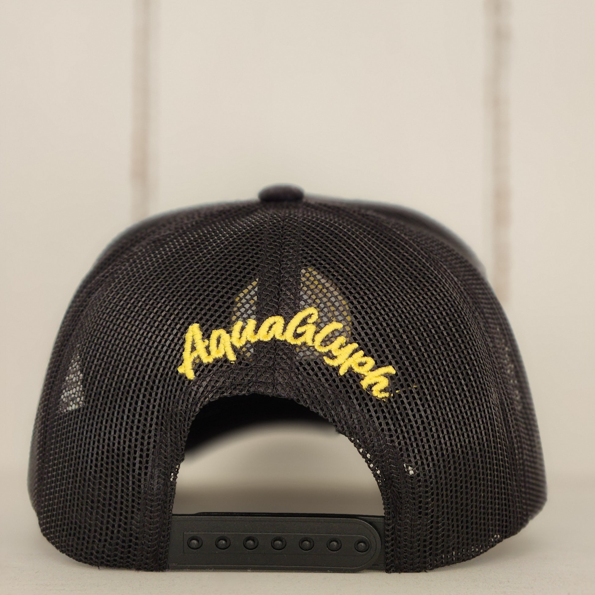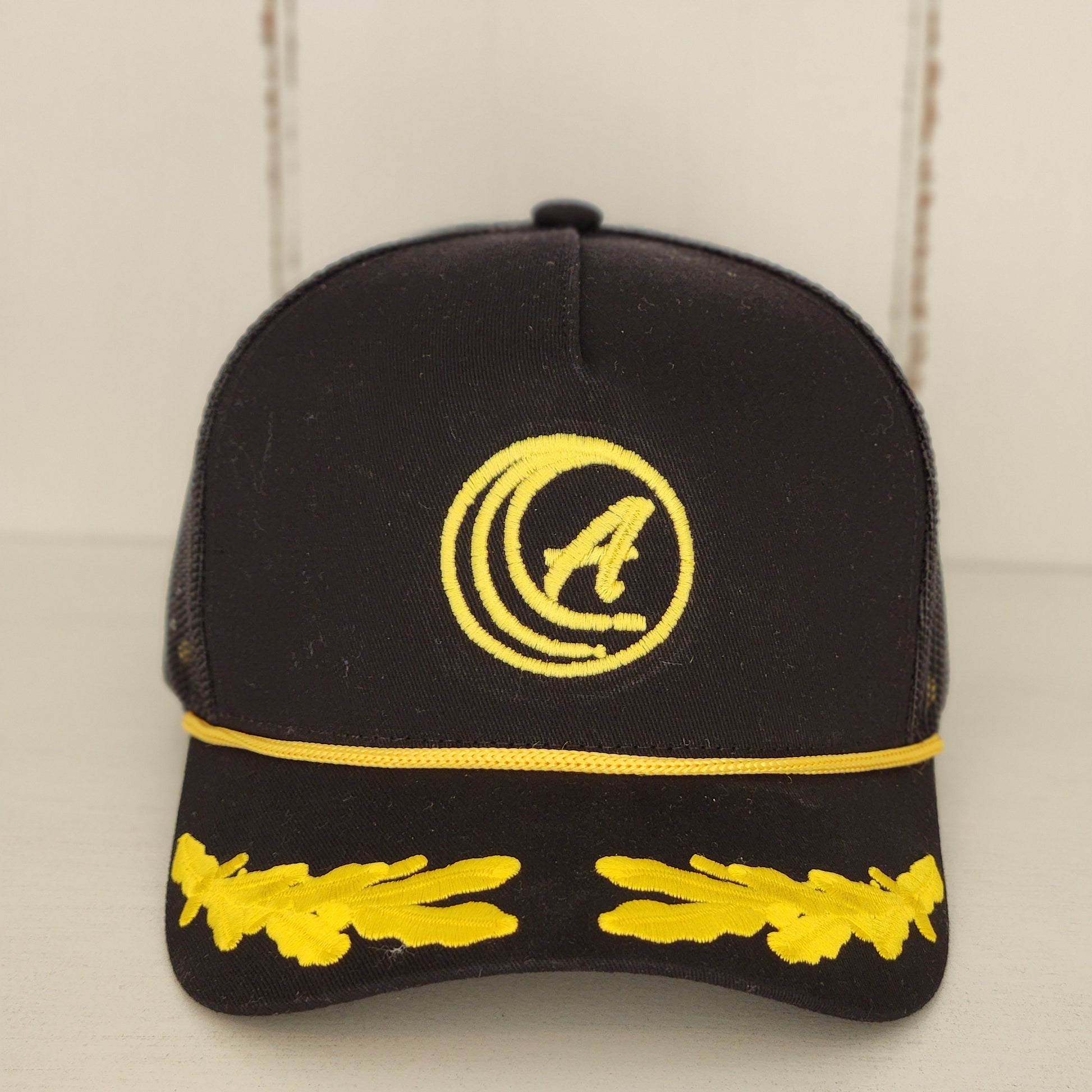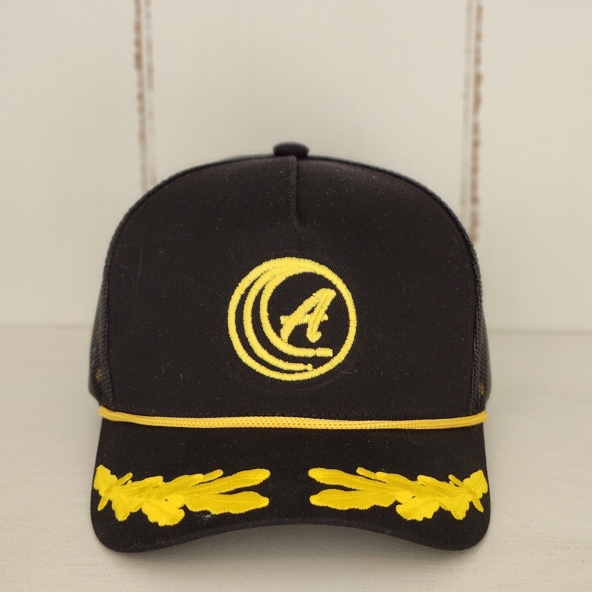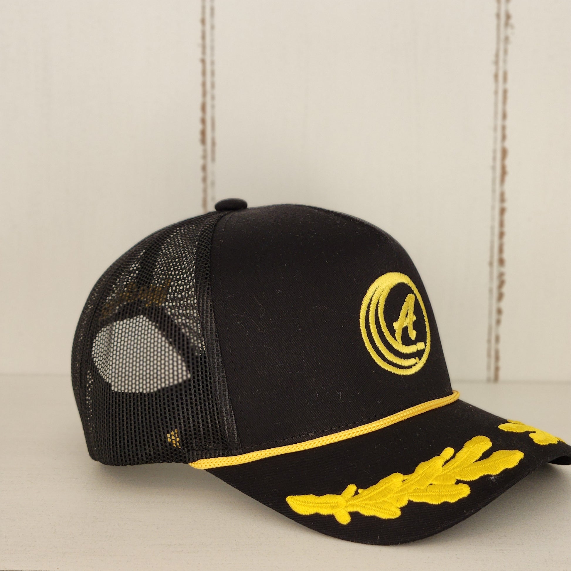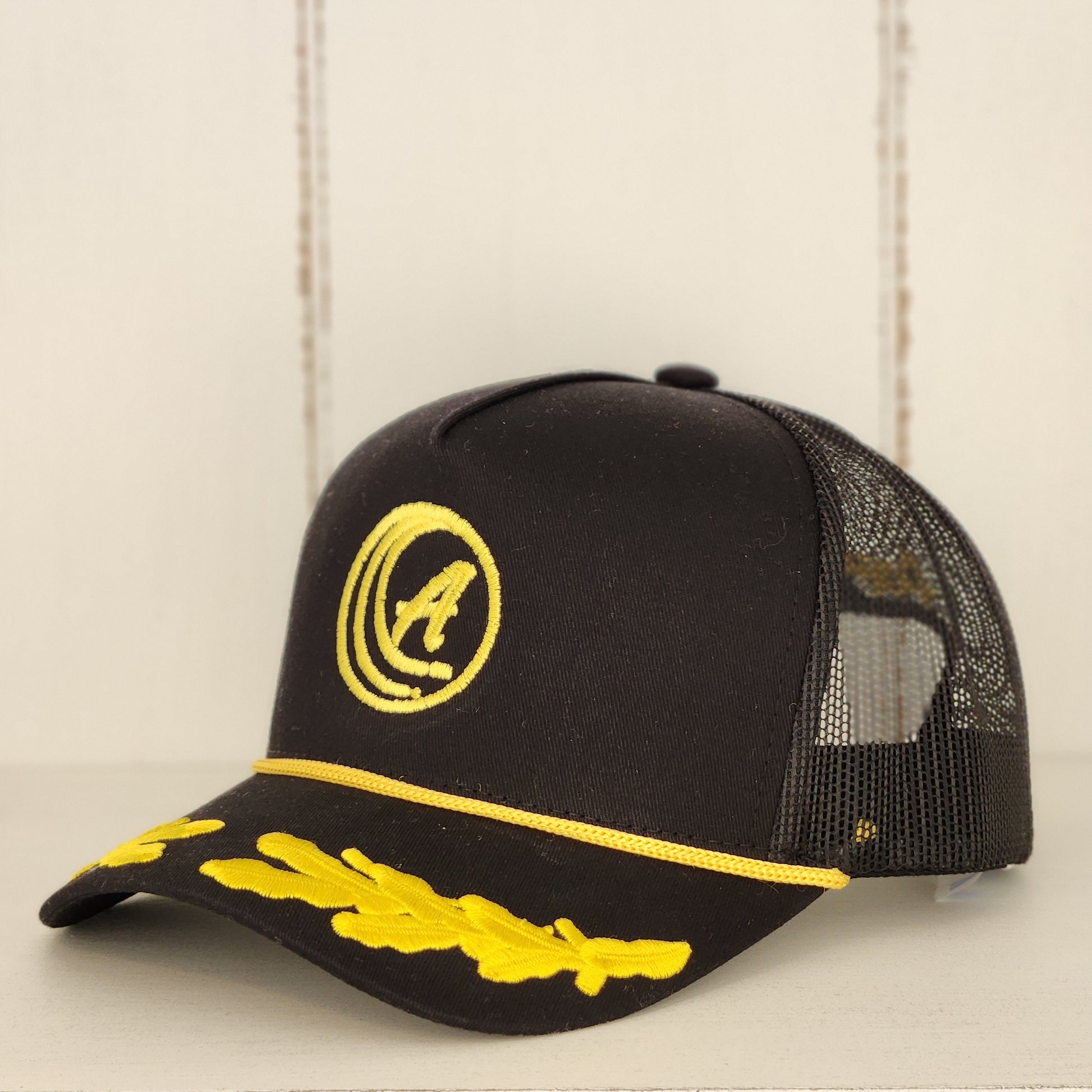 Show 'em who's the boss at your beach! Our Captain A-Frame Trucker Cap is a 5-panel cotton twill cap that features gold rope, gold scrambled egg embroidery on the bill and our signature A-Frame logo embroidered on the front. So fun!