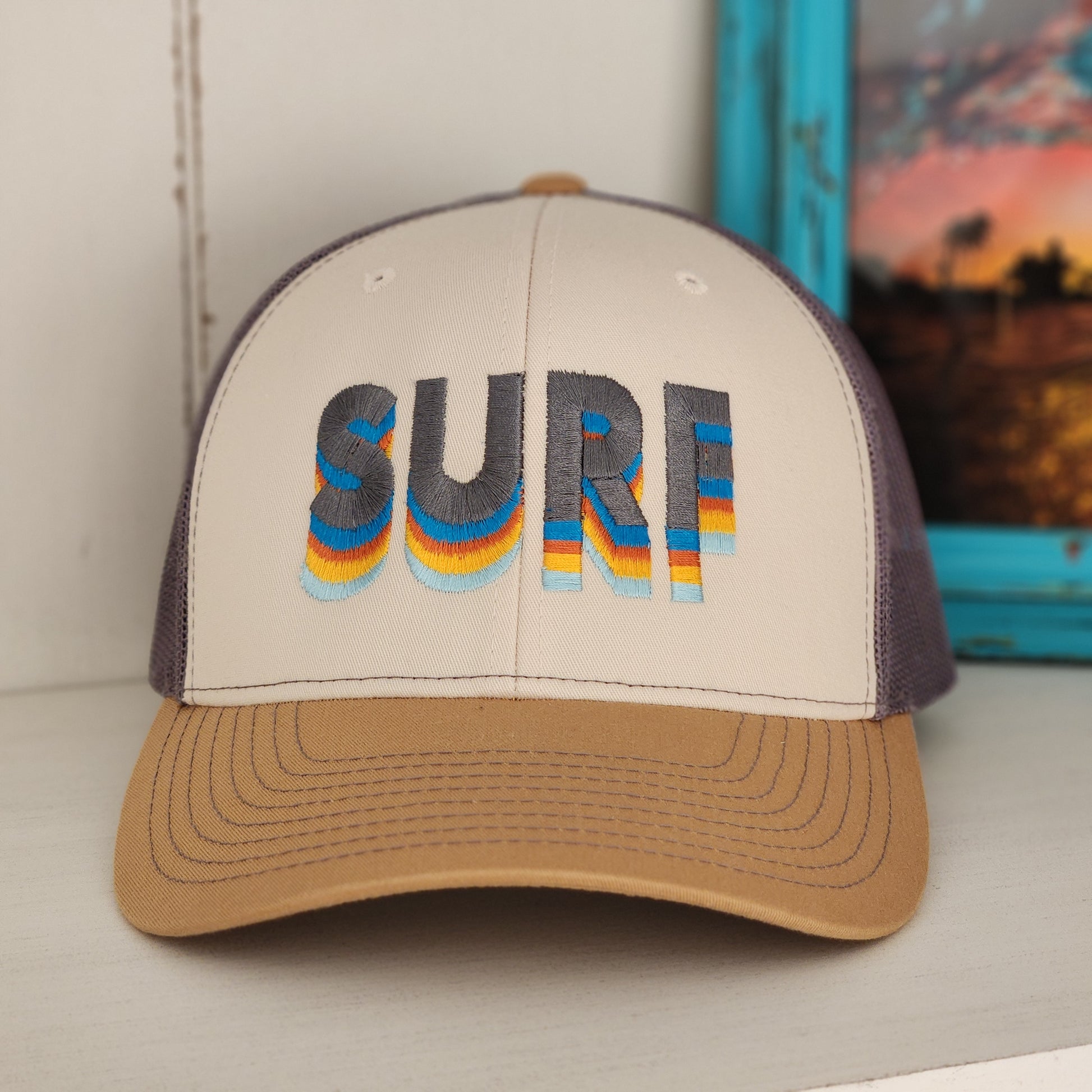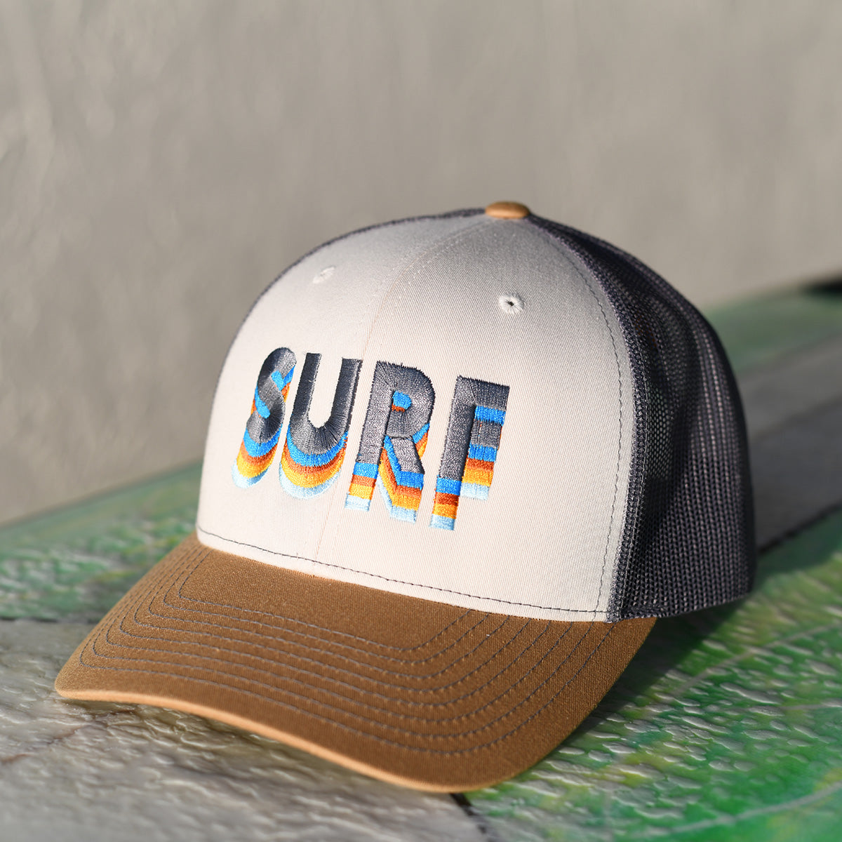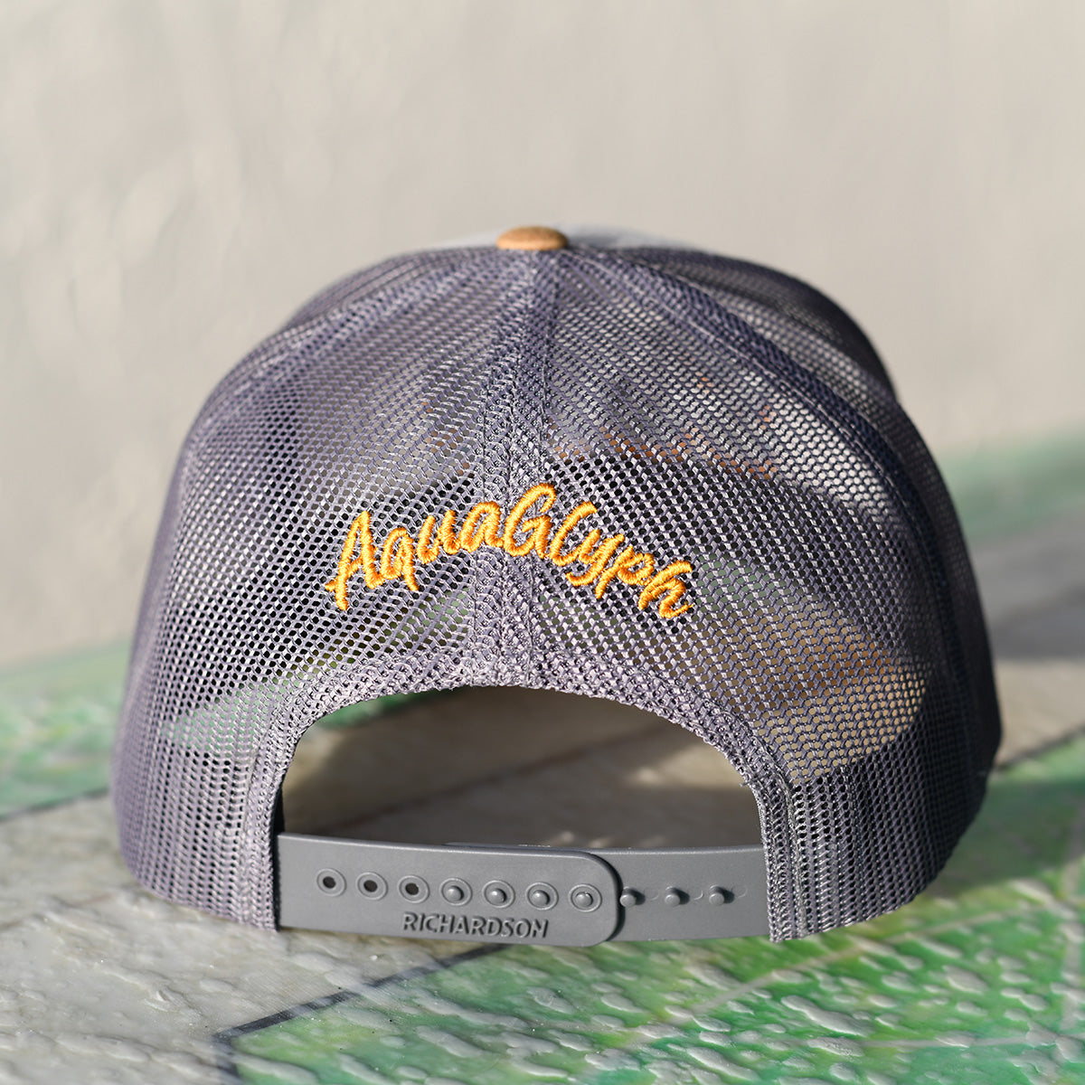Since all we think about is SURF, we thought it appropriate to wear it proudly on our forehead. This color combo is so retro, but oh so new all at the same time! This is a structured, 112 Richardson trucker hat with a mid-profile, six-panel design. All AquaGlyph hats are known for their quality and durability.